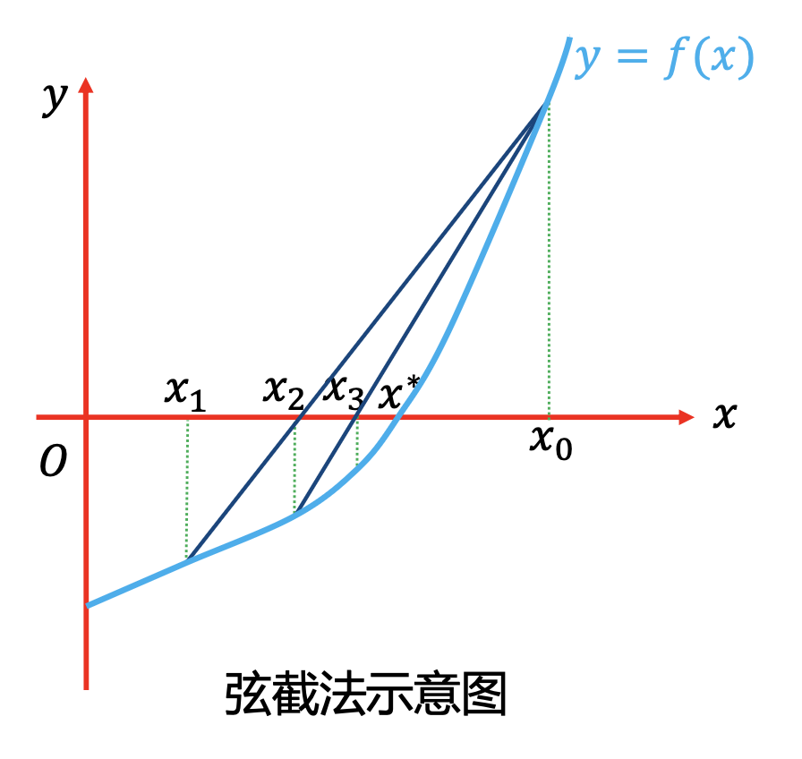 两点弦截法:从上面右边的两点弦截法失败示例图可以看出,如果此时 \(x_0\) 和 \(x_1\) 选择在了根的异侧,那么弦截法就可能失败。所以我们要求 \(f(x_0)f''(x_0)>0\) 的同时,要求 \(f(x_0)f(x_1)>0\)。因为 \(f''(x)\) 始终不变号,所以这也相当于要求 \(f(x_1)f''(x_1)>0\)。