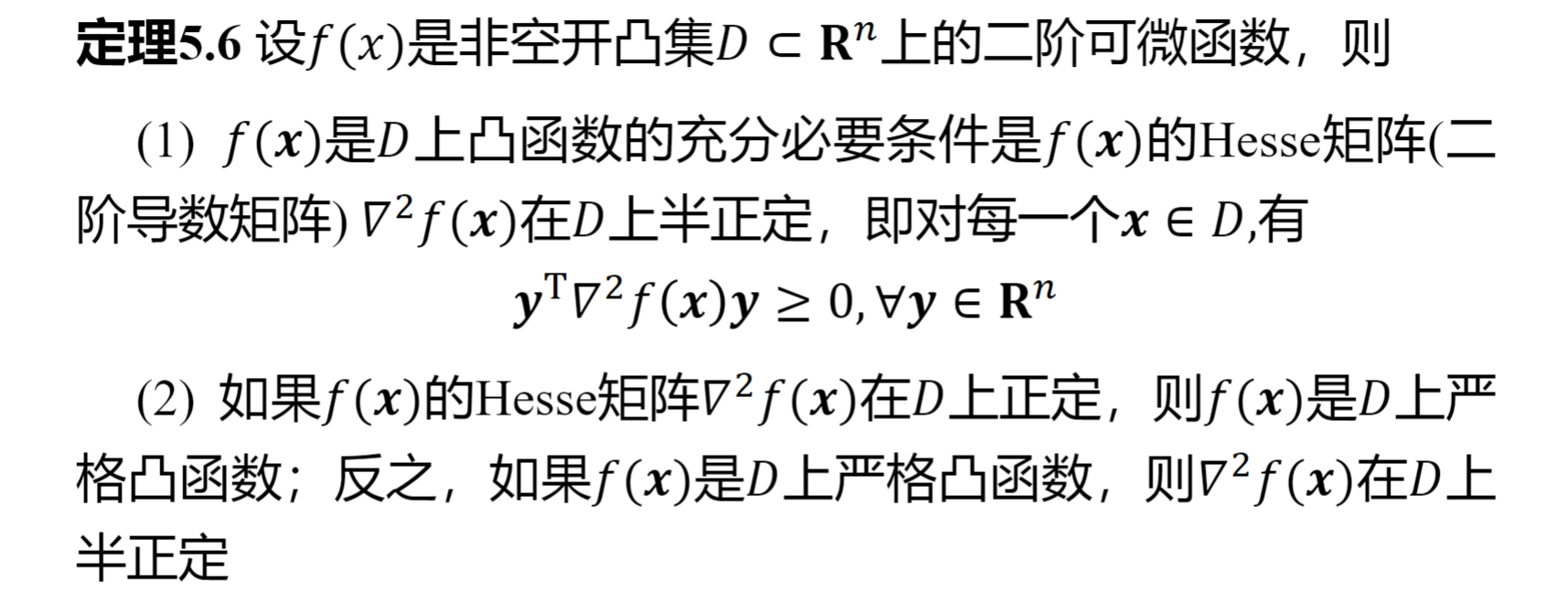 个人认为这些偏向数学原理的部分简单记住就好。同时注意 Hessen 矩阵的正定与半正定和严格凸函数之间的关系——函数严格凸是只能证明 Hessen 矩阵半正定而不是正定。
