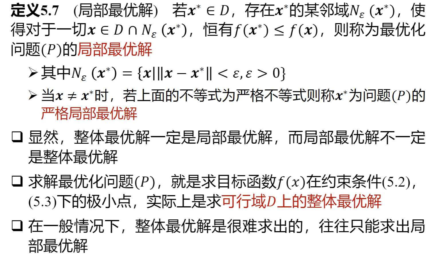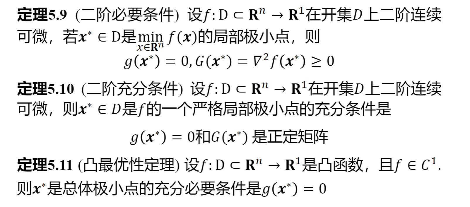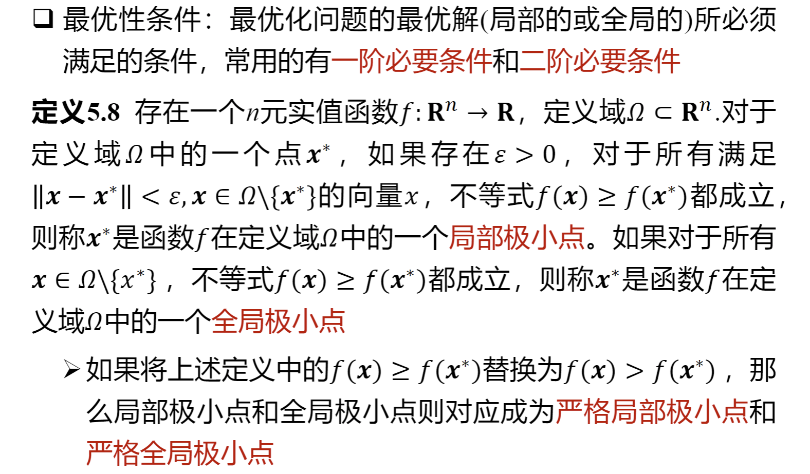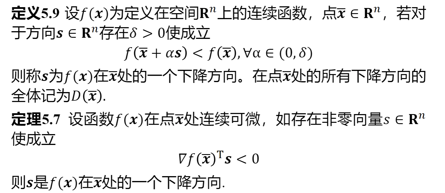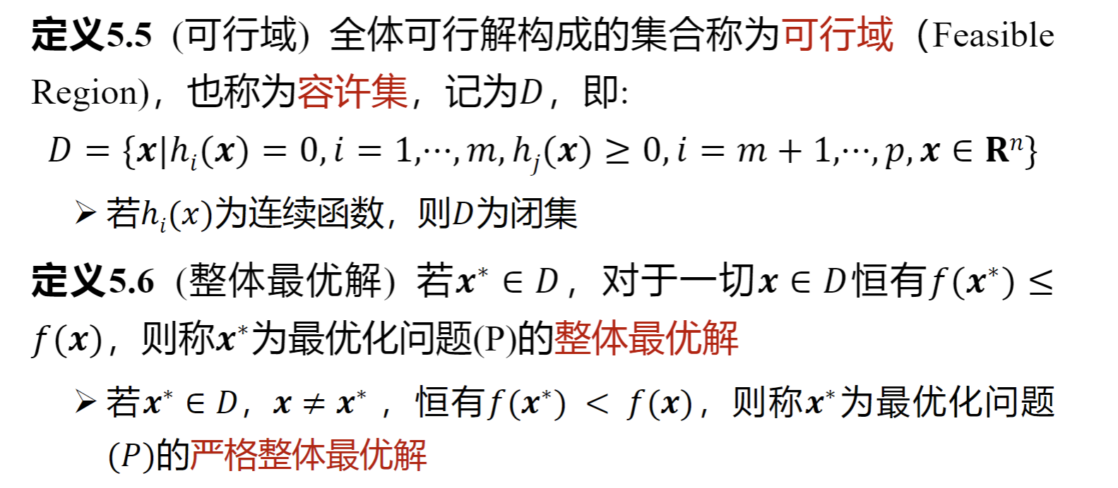 可行解、等式约束、不等式约束、整体最优解/严格整体最优解、局部最优解/严格局部最优解、一阶/二阶必要条件、二阶充分条件、凸最优性定理、(严格)局部/全局极小点、下降方向、局部收敛算法、全局收敛算法、收敛速度。