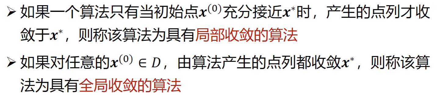 局部收敛与全局收敛:一般情况下只有全局收敛的算法才有实用意义,但是算法的局部收敛性分析也是全局收敛性分析的基础